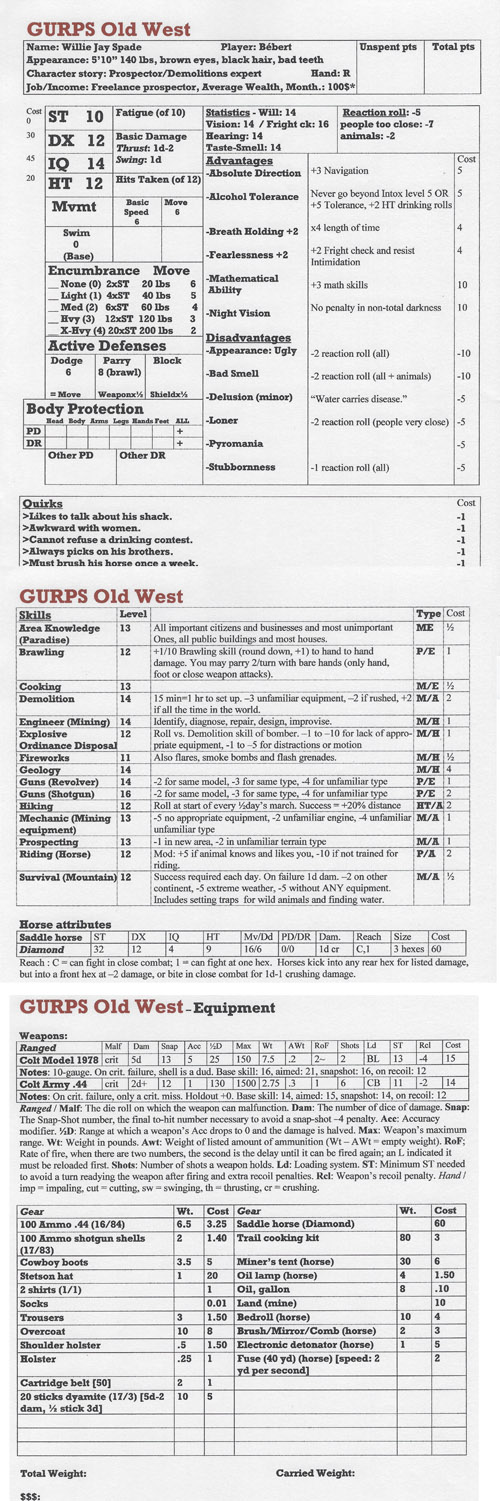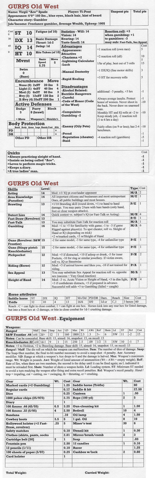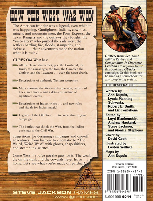 GURPS Old West (2nd ed.) is by Ann Dupuis, Lynda Manning-Schwartz, Robert E. Smith, Liz Tornabene, Stephen Dedman and Mike Hurst, with cover by David Cooke and interior art by Loston Wallace. Back cover copy: