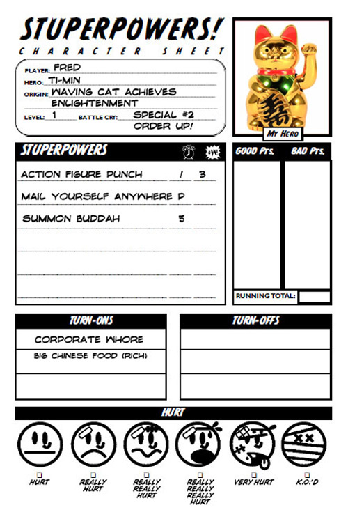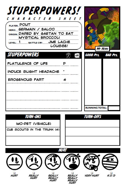 And the character sheets for Siskoid’s group (some elements in French), starting with the “converted” character from his DC Heroes campaign: