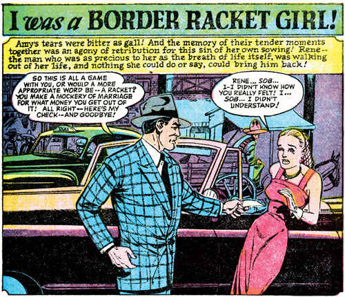 Highlights from “I Was a Border Racket Girl!” (Fawcett’s Sweethearts #107, Jan 1952, art by Bob Powell):