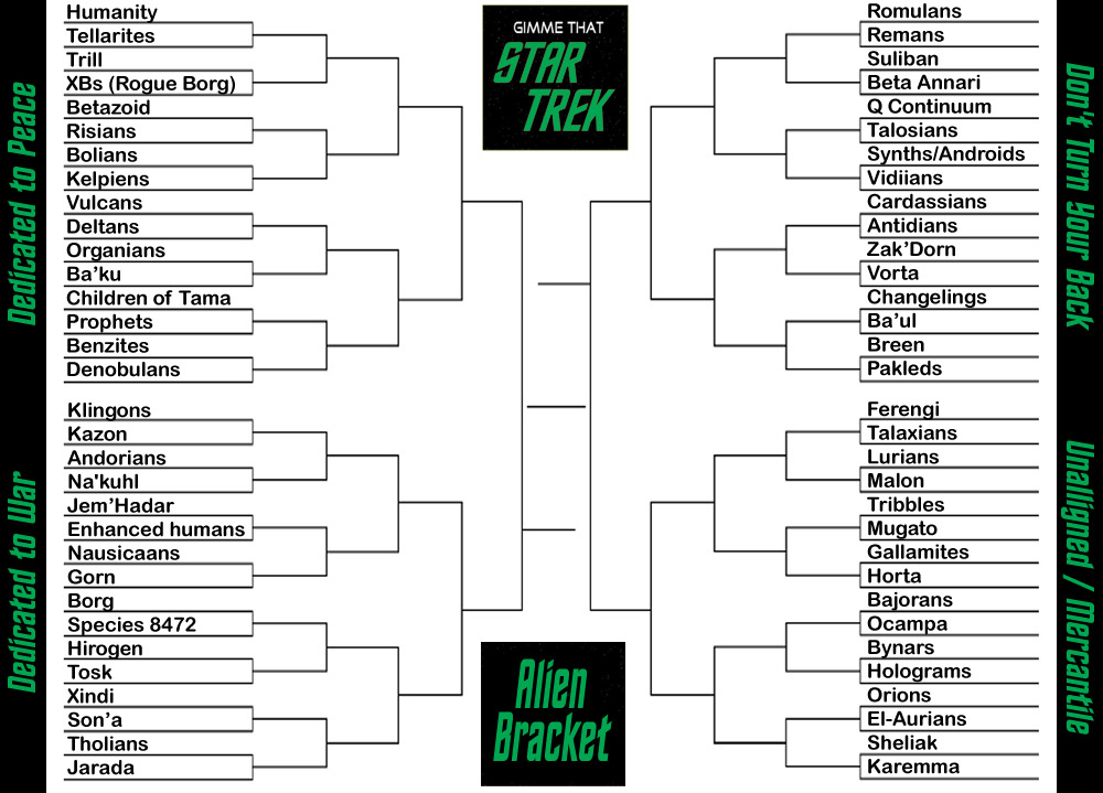 Grab a copy of the sheet, fill it out until it names a winner and send it to Siskoid no later than March 31st to enter. One point per slot correctly entered. Ties broken by coin flip/dice throw. Identity of panelists secret until transmission. Their criteria (historical importance, look, culture, originality, personal preference, etc.) entirely their own. Winner announced in Subspace Transmissions at the end of the Bracket episode.