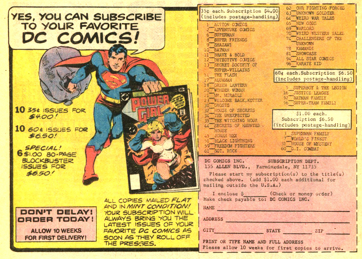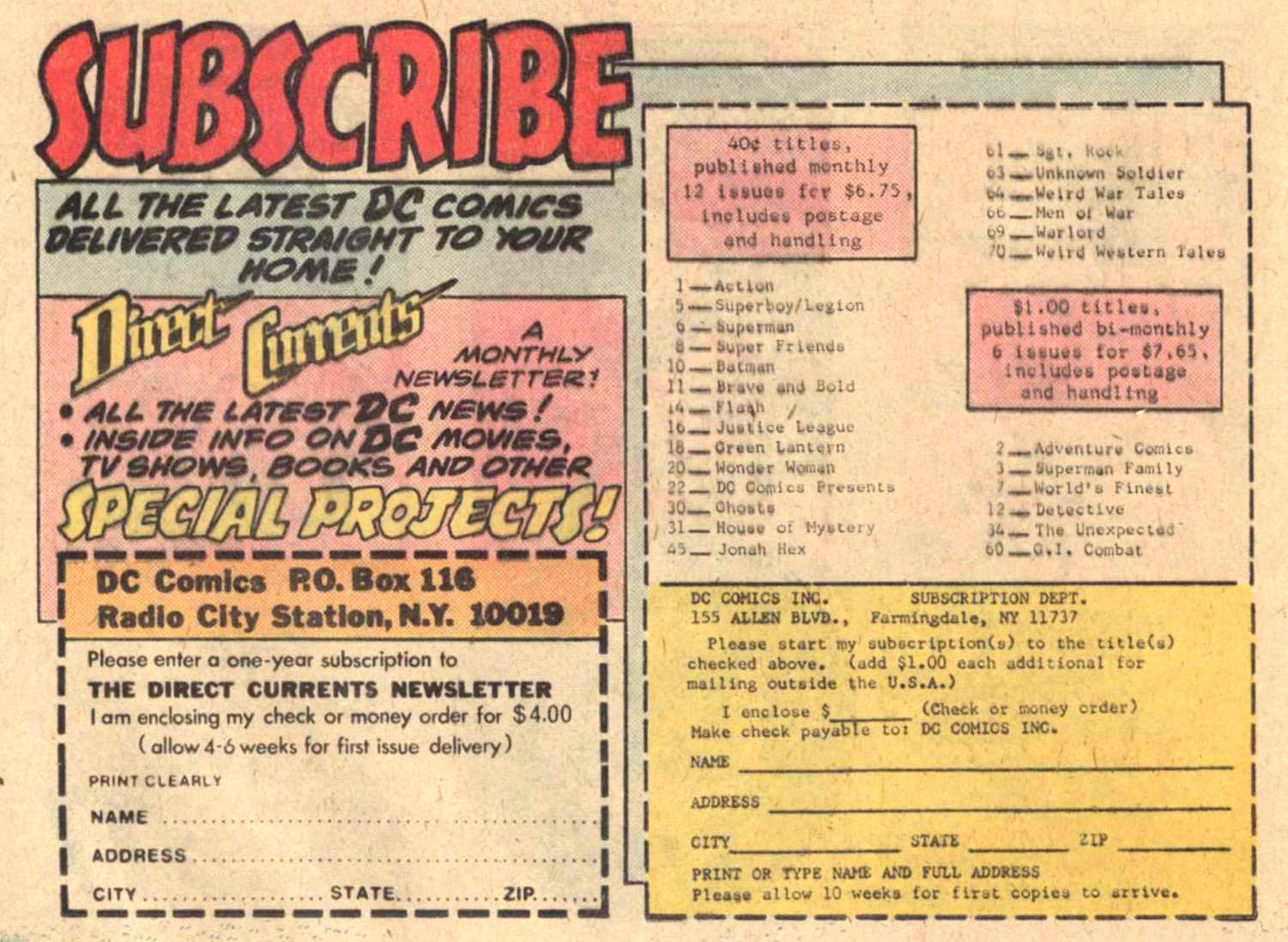 Following are the various DC Comics Subscription house ads from 1978 to 1981, compiled by Isamu Hideaki-Yukinori. Are there any missing? Send a scan to isamu17@yahoo.com and he will place it here.