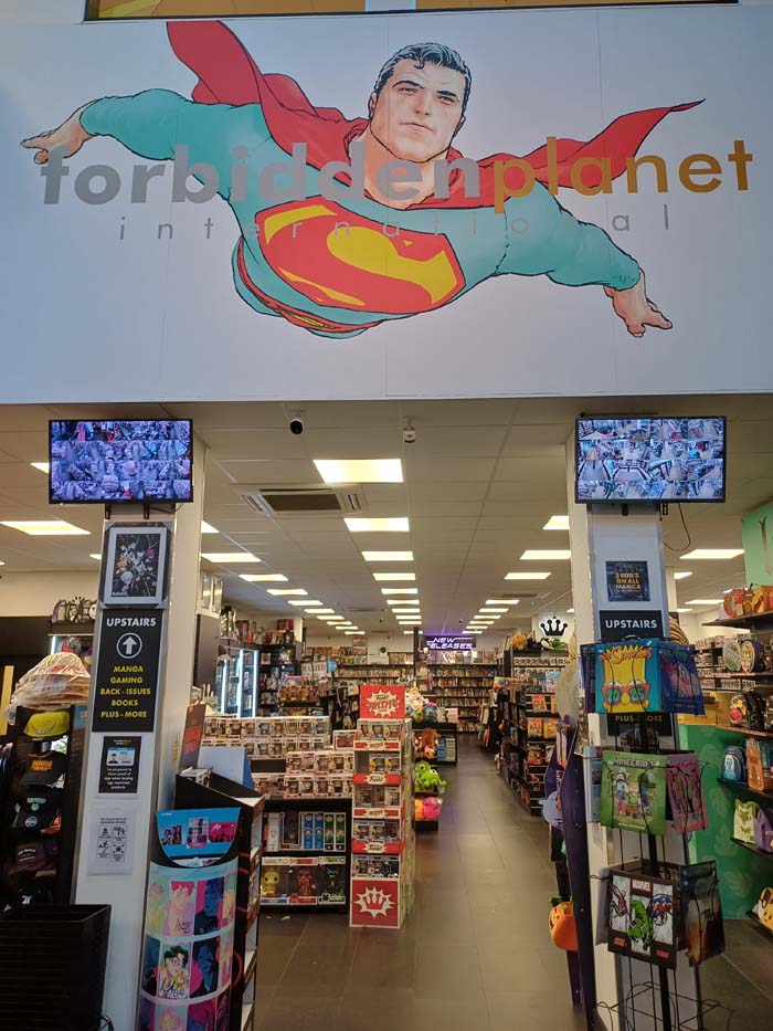 Courtesy of Peter, here is the entrance to Forbidden Planet in Glasgow – a mural by Frank Quitely that greets you as you enter the store.