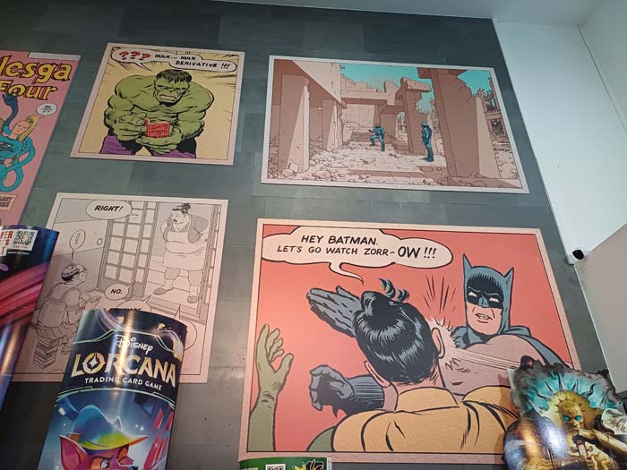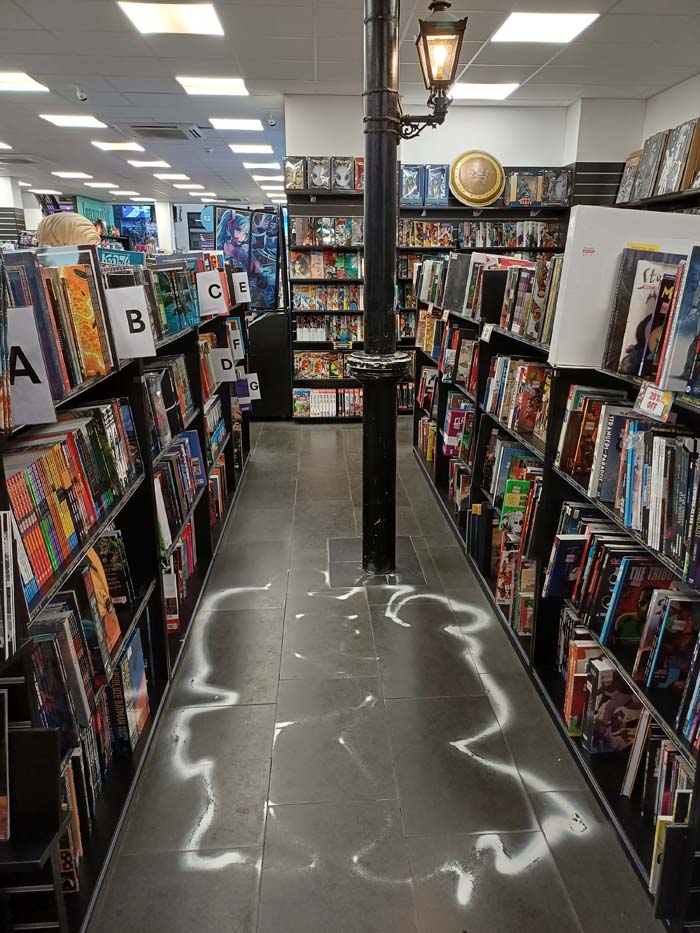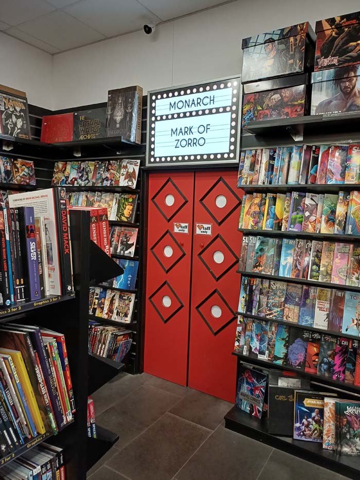 Peter tells us that when Frank saw the pillars at the back of the shop, he thought of turning them into an homage to Crime Alley where the Waynes were murdered! The ‘Monarch’ cinema is actually a storage cupboard where Peter keeps overstock of graphic novels and comic supplies!