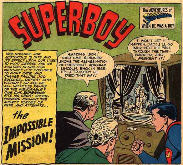 This past spring, I spoke at a conference focusing on the Lincoln Assassination. My topic was depictions of the assassination in comic books and graphic novels. The story from Superboy #85 was one of the several stories I selected for my talk. In the end of the story, Superboy says that no mere mortal (not even a Superboy) can change fate so it would be no use to even try to go back in time again to change history. Then in a story published shortly afterward, he (as his adult self, Superman) again goes back in time to try to save Lincoln. Ha! That one was published in Superman #146 (July 1961). The story was called “Superman’s Greatest Feats” and was again written by Jerry Siegel.