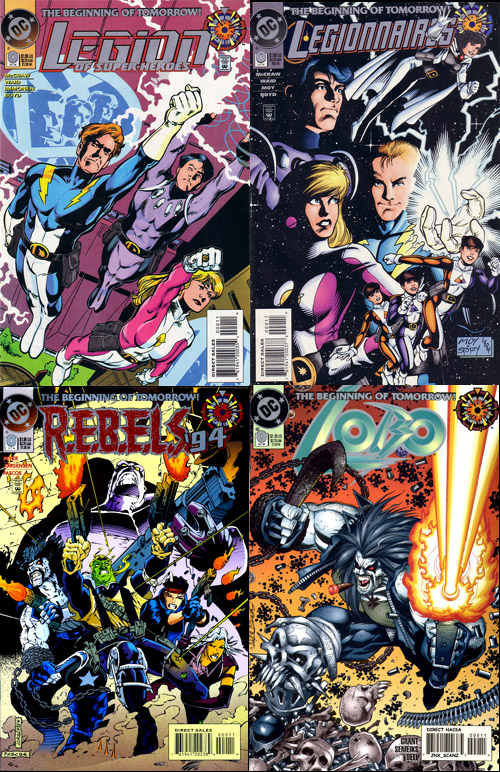 Highlights from Legion of Super-Heroes #0 by Tom McCraw, Mark Waid, Stuart Immonen and Ron Boyd; Legionnaires #0 by Tom McCraw, Mark Waid, Jeffrey Moy and Rob Boyd; R.E.B.E.L.S.’94 #0 by Tennessee Peyer, Arnie Jorgensen and James Pascoe; and Lobo #0 by Alan Grant, Val Semeiks and John Dell: